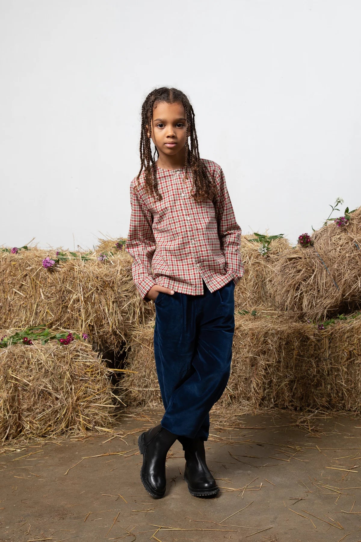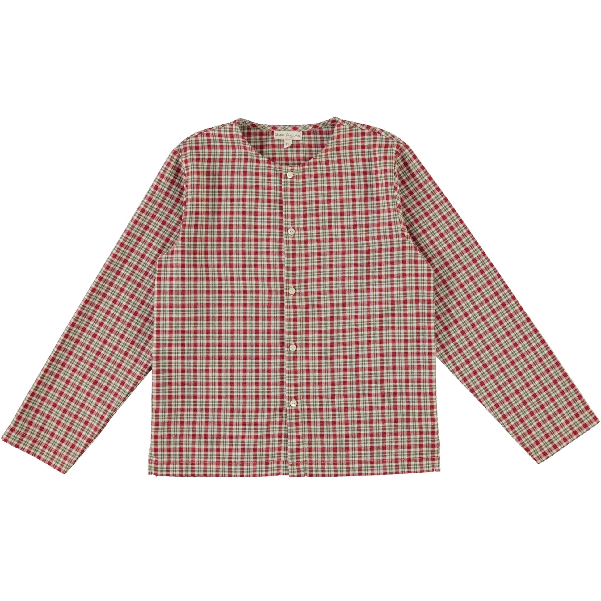 Celebrate the festivities with this adorable timeless Luka baby shirt in nostalgia check in adorable red, green and natural colours. Easy and comfortable button down loose fit shirt is made of softest organic cotton. Features front opening, round collar and long sleeves. Perfect match with Claude overall. Perfect for first Christmas celebrations and family pictures.