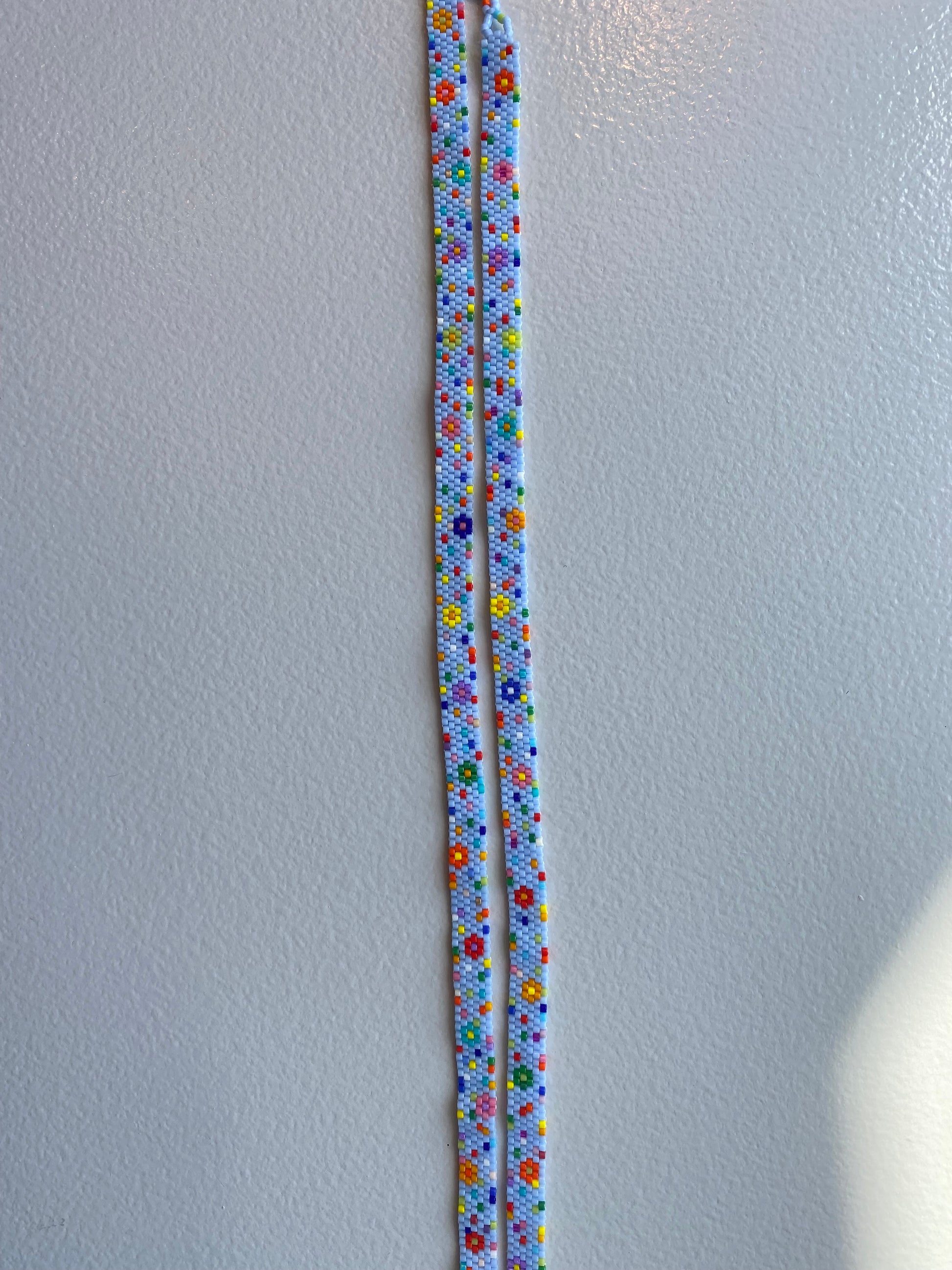 Glass seed beads hand stitched with sterling silver clasp.