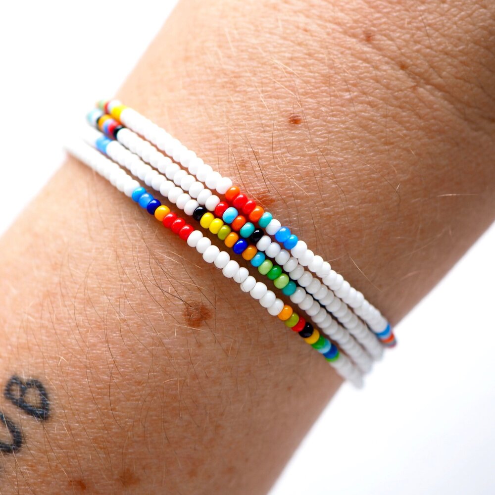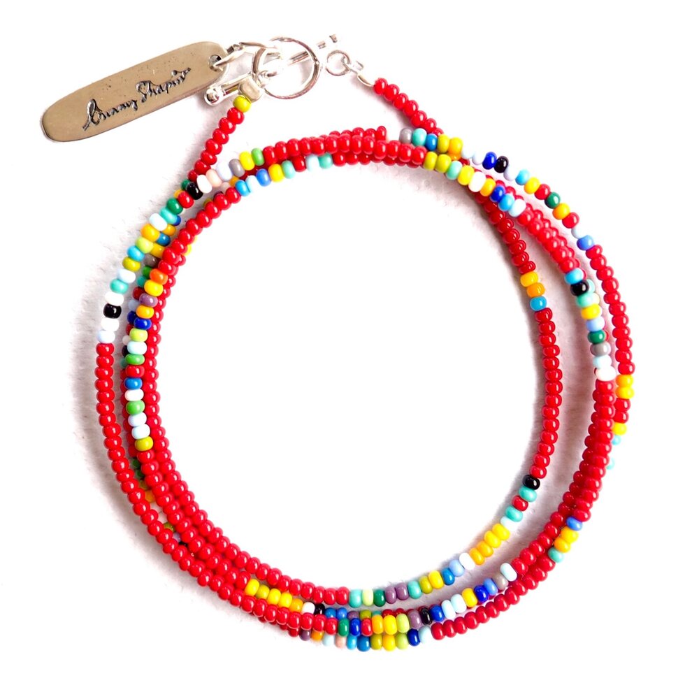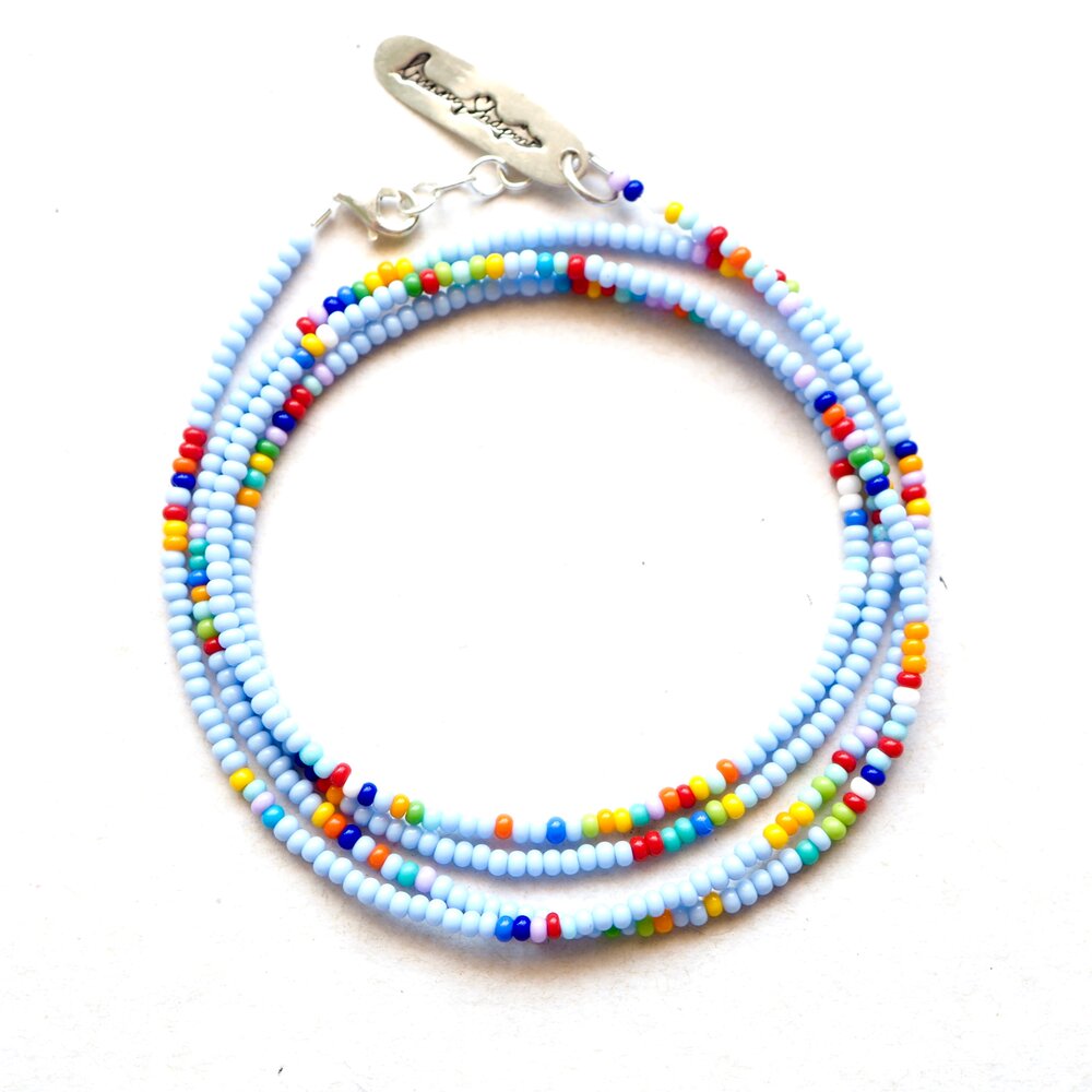 Our signature Sammy Wrap Bracelet is hand crafted with glass seed beads and a sterling silver lobster claw closure. Sammy is water resistant and looks great in multiples stacked up your arm.