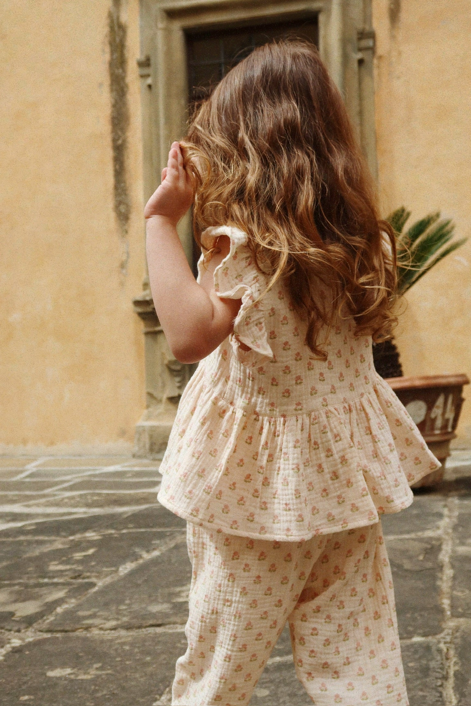 Soft top in a light and breathable muslin quality. The Coco top is designed in a delicate peplum silhouette with a skirt effect. Closes with a single button in the back.