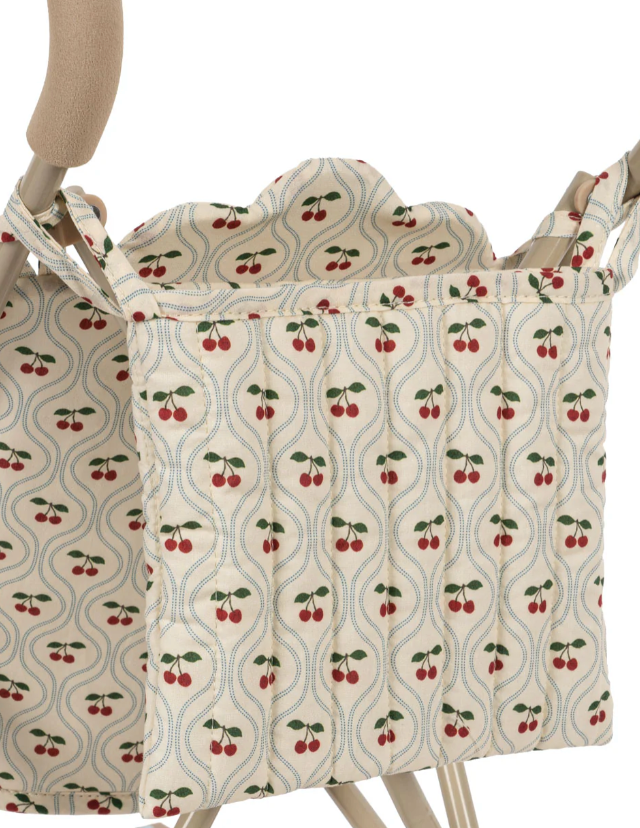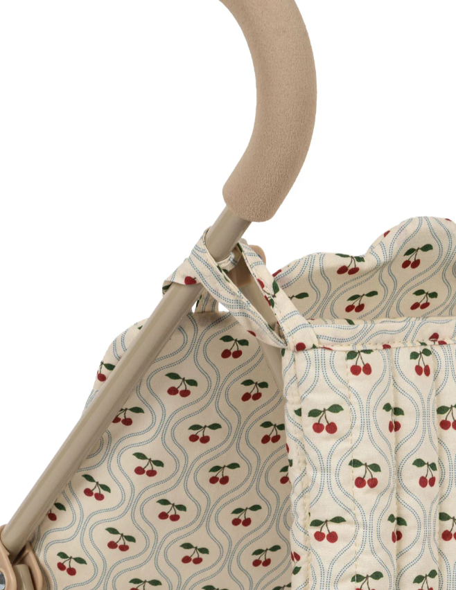 Doll stroller designed with a harness, carriage bag, and double wheels on all four legs for extra stability.