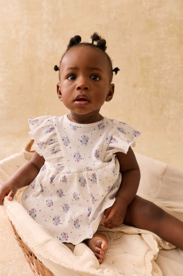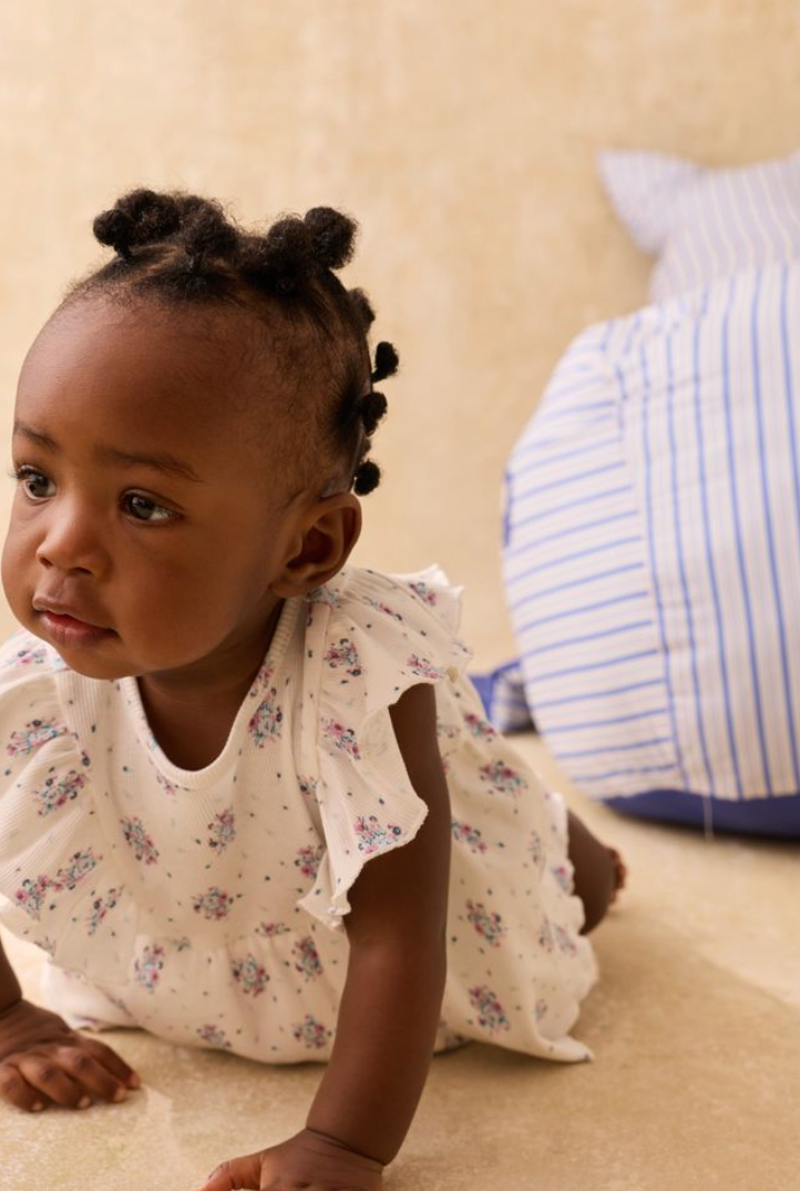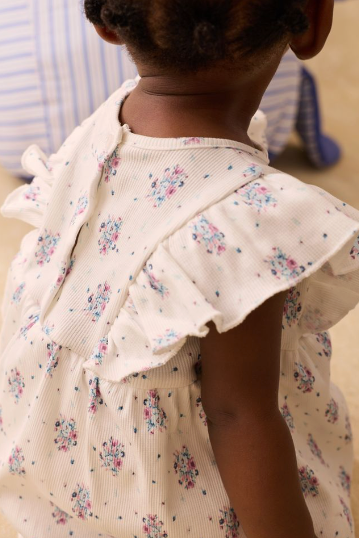 Cotton jersey dress-style romper. Ruffles at armholes. Elasticized thighs. Partial button placket at the back. Lined.