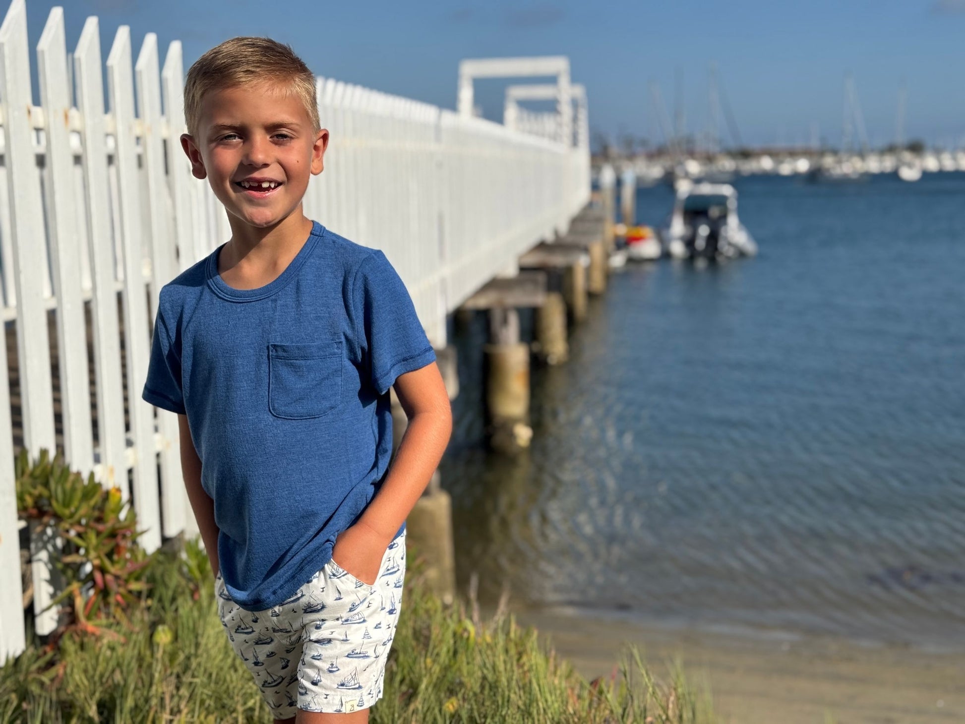 Set your little guy up for summer fun with these navy boats printed shorts!