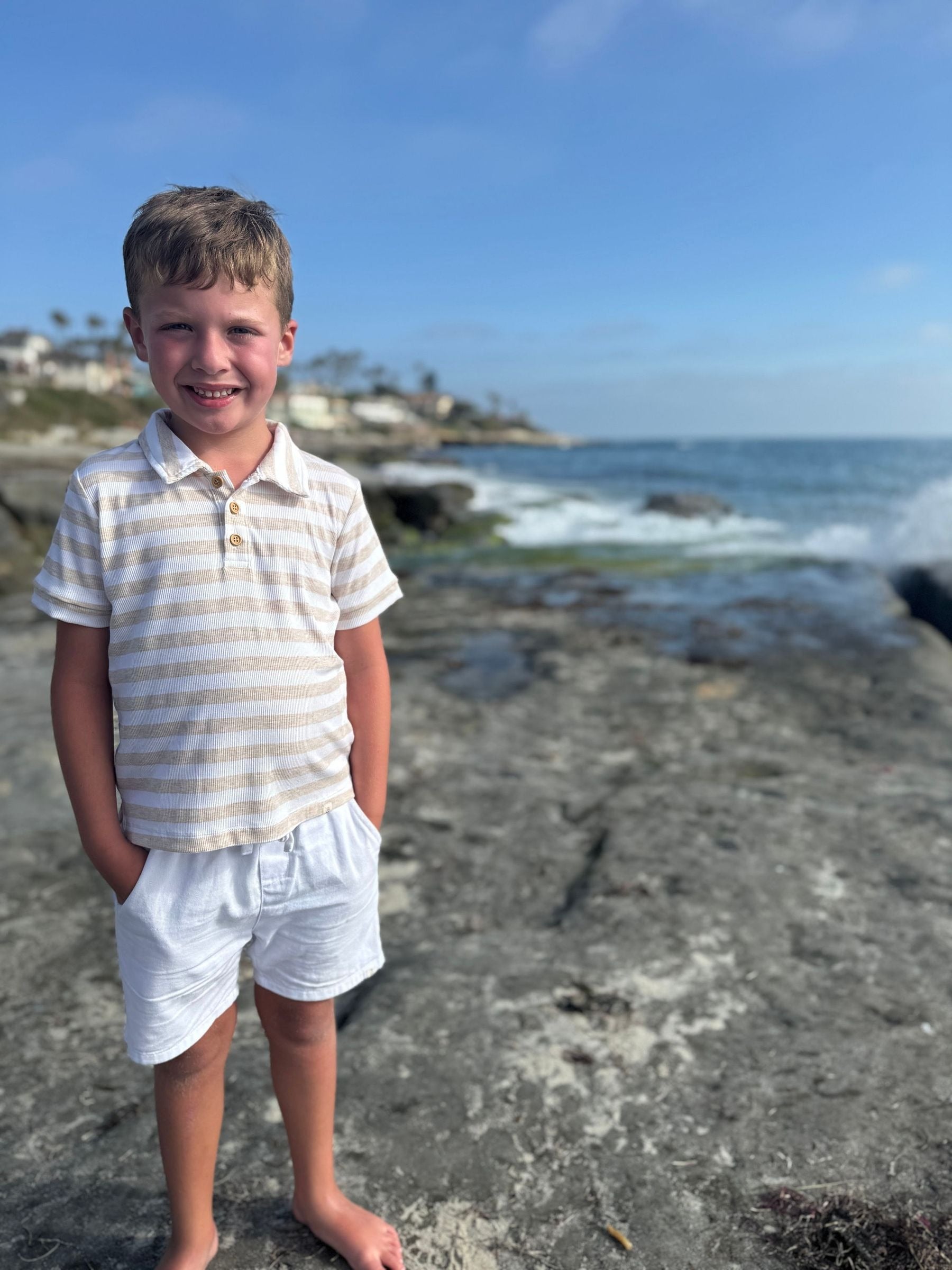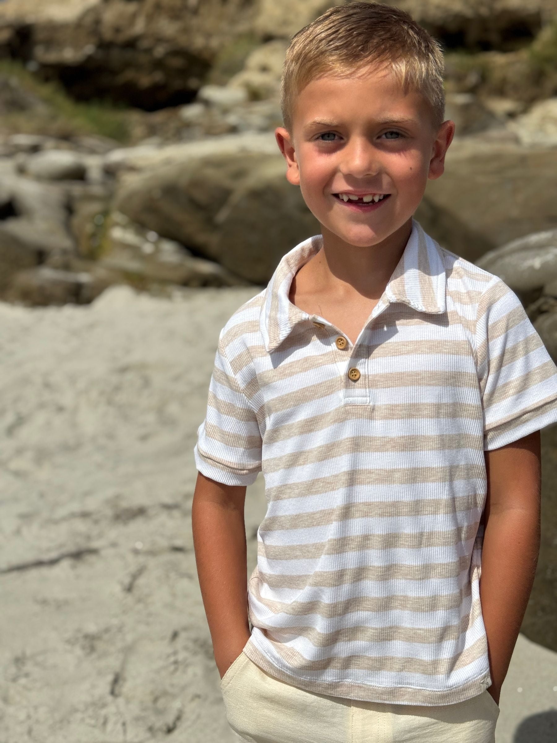 Embrace sunny days in our Shipping polo, crafted from soft jersey cotton for all day comfort. Its neutral color way pairs perfectly with beach vibes and Spring/Summer adventures, while our timeless wooden buttons add a charming touch.