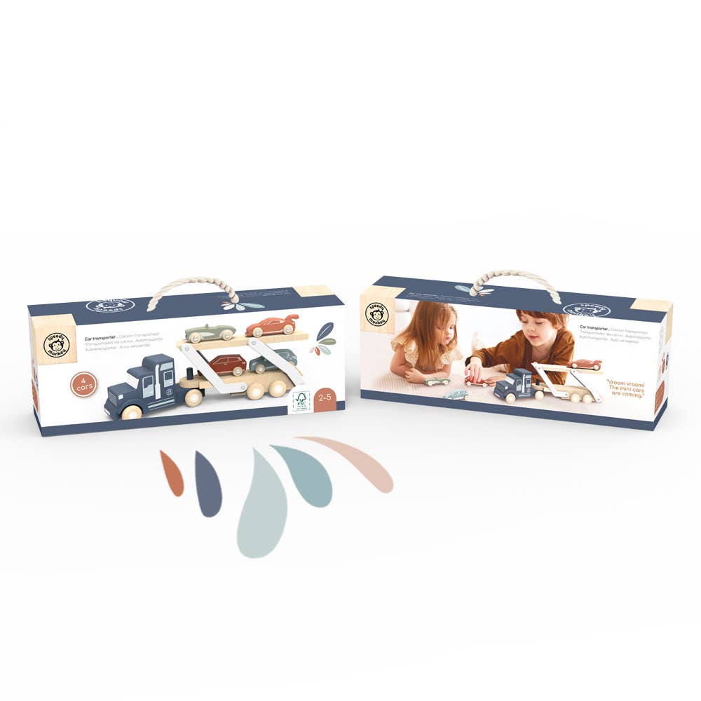 This wooden car transporter truck toy has a double-deck trailer. It easily converts for loading and unloading.
